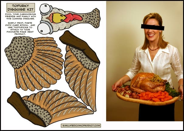 The guys over at simulatedcomicproduct.com have come up with a clever Tofurky Disguise Kit. They show just how easy it is for a vegan family member to blend in to any meat-eating celebration! You can download and print out a cute turkey template right here.