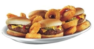 - Smokin’ Q Four Pack, featuring four mini burgers topped with BBQ sauce, crispy onion rings, Cheddar cheese and bacon, served with a double portion of onion rings