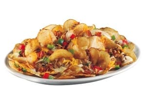- Potachos (left), made with freshly fried and seasoned kettle chips topped with crumbled sausage, bacon, bell pepper and onion mix, cheese sauce and shredded Cheddar cheese