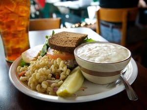 They are known for their salads, like the popular Garlic Chicken Salad with lettuce, avocado, cruncy noodles and caramelized walnuts. “We were doing caramelized 10 years ago,” points out Berkman. “We’ve always been ahead of the curve.” Or, try The Walnut that Kissed the Chicken sandwich (pictured here, with a bowl of Cockie Leeky soup) with chicken, light mayo, walnuts and celery served on squaw bread. Or, a house favorite—the Chicken Enchiladas Verde (pictured). There’s a lot to try; it’s a 24-page menu.