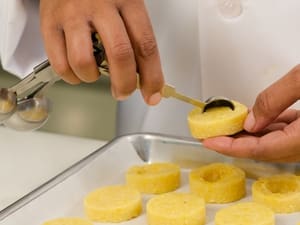 Scoop out the centers of each polenta circle with a ½ teaspoon measuring spoon, taking care not to make a hole in the bottom of the circle.