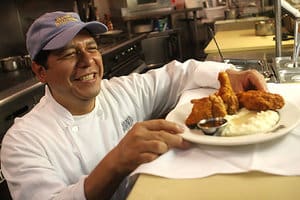 The Blue Ribbon Brasserie has won lots of awards for its fried chicken. Speaking of himself and the other two owners, co-owner Kris Polak told Rachel Wharton of the New York Daily News, ‘We’re just a bunch of Jewish boys from New York, but we’re also French-trained chefs. We were just trying to make a fried chicken that was really cool.’ They batter their birds in egg whites and flour spiked with matzo meal, then dust the birds just out of the fryer with a blend of seasonings—salt, pepper, paprika and herbs—that they dry and grind themselves. It’s served with mashed potatoes and collard greens and sells for $21.