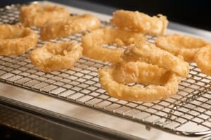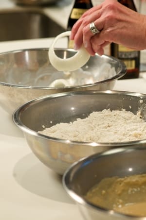 For best results, have everything set up assembly-line style before you start frying. Arrange bowls of drained buttermilk-soaked onion rings, seasoned flour and beer batter on the counter, along with a baking rack layered on a sheet pan to drain battered onion rings.