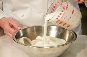 Soak onion rings in in a bowl with 2 cups of buttermilk.