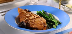 Add prunes to the pan, evenly distributing them between the chicken pieces. If necessary, add more water to barely cover the prunes. Simmer in the covered pan approximately 15 minutes, occasionally turning the chicken. If the sauce becomes too dry and begins to stick to the bottom of the pan, stir in additional water as needed. Remove from heat when the chicken and prunes are tender. Transfer chicken to serving platter. Stir half the almonds into the pan with the sauce, then spoon over chicken.