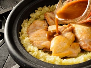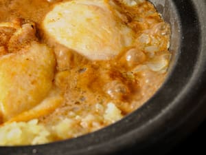 Return onions to the skillet. (Alternatively, transfer chicken thighs and onions to a tagine over medium heat). Pour spice/water mixture over thighs and onions.