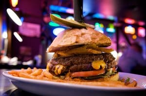 And then there is the burger. It’s not just any burger; it’s what they call “The Big Mother-Shucker,” a full one-pound patty stuffed with bacon and cheese, then topped with lettuce, tomato, pickles, grilled mushrooms, more cheese, fried onion straws and a secret “mother shucken” sauce, all on a giant—and we mean giant—toasted bun.