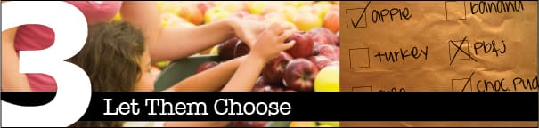 3. Let Them Choose: The trend is all about ‘my way.’ Making choices starts earlier these days, so let kids practice by giving them a say in what goes in their lunch. It’s as simple as giving them a weekly list or a brown paper bag on which to record their choices. Use the weekend to pretend you are Wich Wich? and let the kids write out their own menu choices (limited, of course, to your master list) for each day. You can even require them to choose one from each category, so that lunch is not made up entirely of dessert!