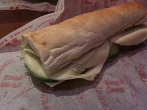 Dinner tonight was pretty interesting…I went to Jimmy John’s with friends. Now, here I always order the #9 with no onions. The #9 is the Italian Night Club and it is outstanding. Here’s what is on the sub: real Genoa salami, Italian capicola, smoked ham and provolone cheese topped with lettuce, tomato, mayo, homemade vinaigrette and banana peppers. You drooling yet? Anyway, so here’s what I had to order…the #6 aka the Vegetarian. This has provolone cheese, avocado, alfalfa, cucumber, lettuce, tomato and mayo. I won’t lie, it was pretty tasty. But when 3 out of 5 people are eating a #9, I had to look out the window and try to enjoy my meatless sub.