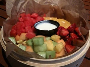 We arrived at our hotel and by this point, I was pretty hungry. In the lobby of the hotel, they had pitchers with citrus-infused water. Yum, but not something to fill my stomach. We decided to grab some dinner at Quench, the poolside bar and grill. I looked over the menu and I was immediately drawn to the Blackened Grouper sandwich. And, we all felt like the fruit platter would be a good choice to start off the night.