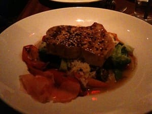 Our food arrived and my swordfish was placed in front of me. I looked down and wow, a nice big swordfish steak over steamed rice and vegetables with a ponzu and ginger glaze. I plunged my fork into the steak and put the piece of perfectly, tender swordfish in my mouth. It melted and so did I.