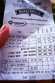 Just like the ‘Nutrition Facts’ panel you see printed on the food products sold in supermarkets, the Burgerville Smart Receipt lists calories, fiber, fat, sodium, carbohydrate counts and more.