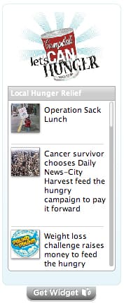Campbell Soup Company is partnering with Students in Free Enterprise (SIFE) to raise awareness of local hunger relief with the release of the Let’s Can Hunger widget. A basic code that can be installed on any web page or social networking site, the widget delivers a constant stream of fresh, relevant information on grassroots hunger relief efforts and the organizations and individuals who are making a difference.
