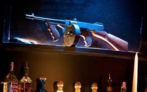 The theme is reflected in the décor, the staff and the menu. The extensive and creative specialty drink list, for example, features the Sucker Punch, the G-Man, and the Kick in the Head. The menu has headings such as Bathtub Gin Soups, Syndicate Salads, and House Specialties You Can’t Refuse, which includes the Rat Pack Ribeye. The red and black décor combines with dim lighting and glittery silver candlelight to create the Al Capone-era ambiance.