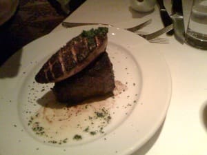 The restaurant is white linen and low lights, although the bar on the opposite side features a plasma TV and live guitar music. And, when you ask the chef what’s great about the restaurant, the immediate answer goes to the food: it’s the steaks, which are all USDA Prime.