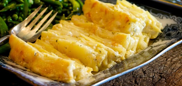 Creamy, cheesy Scalloped Potatoes, made with Fontina cheese, sides superbly with the elegant sirloin roast. Their vibrant golden color adds richness to the dinner.