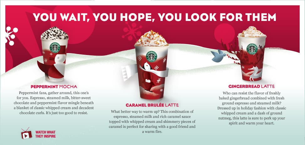 This year Starbucks has hung holiday-flavored beverages on its menu with care: Peppermint Mocha, Gingerbread lattes, and a Caramel Brulée Latte are the designated holiday specials at America’s coffee house.