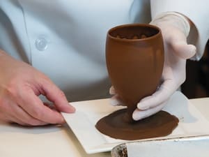 Chef Dennis has his Smucker’s® Magic Shell® and he’s ready to get started. He suggests using latex or plastic gloves to keep hands clean and prevent fingerprints on the hardened shell.
