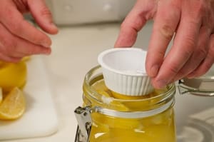 To ensure the lemons remain completely submerged in lemon juice, place the bottom of the ramekin through the mouth of the jar and on top of the lemons.
