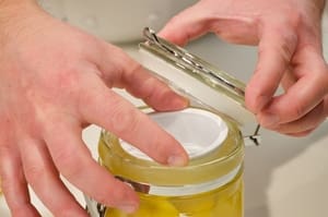 Leaving the ramekin inside the jar, close the lid and clamp it shut.