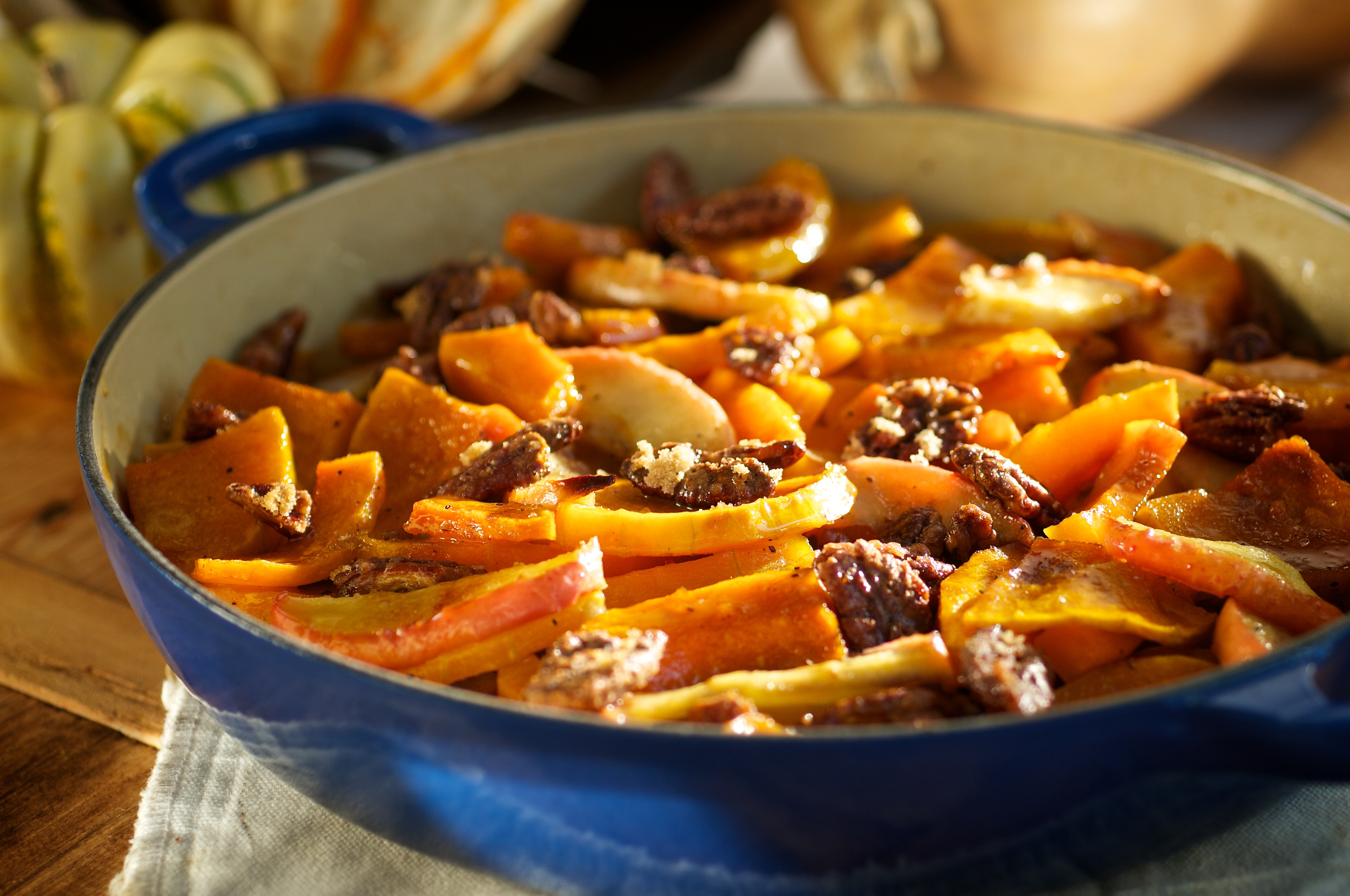It’s meant a lot of tasting, too. There was a delicious sautéed red cabbage nestled next to a pork chop one day, the next day we tried some tasty butternut squash with apples and maple-glazed pecans (shown, left). Then there was an amazing vegetable stir-fry with a sesame chili-orange sauce—not something I whip up at home every day.