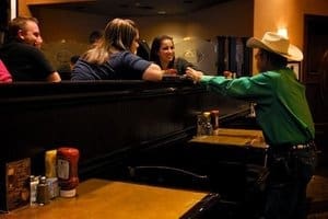 In fact, everything about the place gives an aura of wealth and importance, as though it were built from old Texas money. The sound of gaming is muted against the backdrop of dark paneling, brick, and an extensive collection of black & white Elliott Erwitt artwork on the walls. It just has that leather and amber gold ambiance that says rich, comfortable and urban Western.
