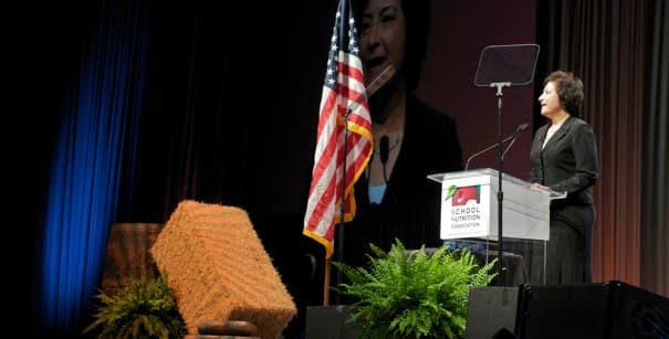 Rivas looked back with pride on a year that found the association responding with a ‘food revolution’ of its own, including a vigorous social media campaign to get out the word about the healthy meals being served in America’s schools. ‘Serving fresh fruits and vegetables and whole grains is certainly nothing new to most of us,’ Rivas told the audience. Rivas talked about her excitement over meeting with First Lady Michelle Obama and getting involved in her Let’s Move! initiative.