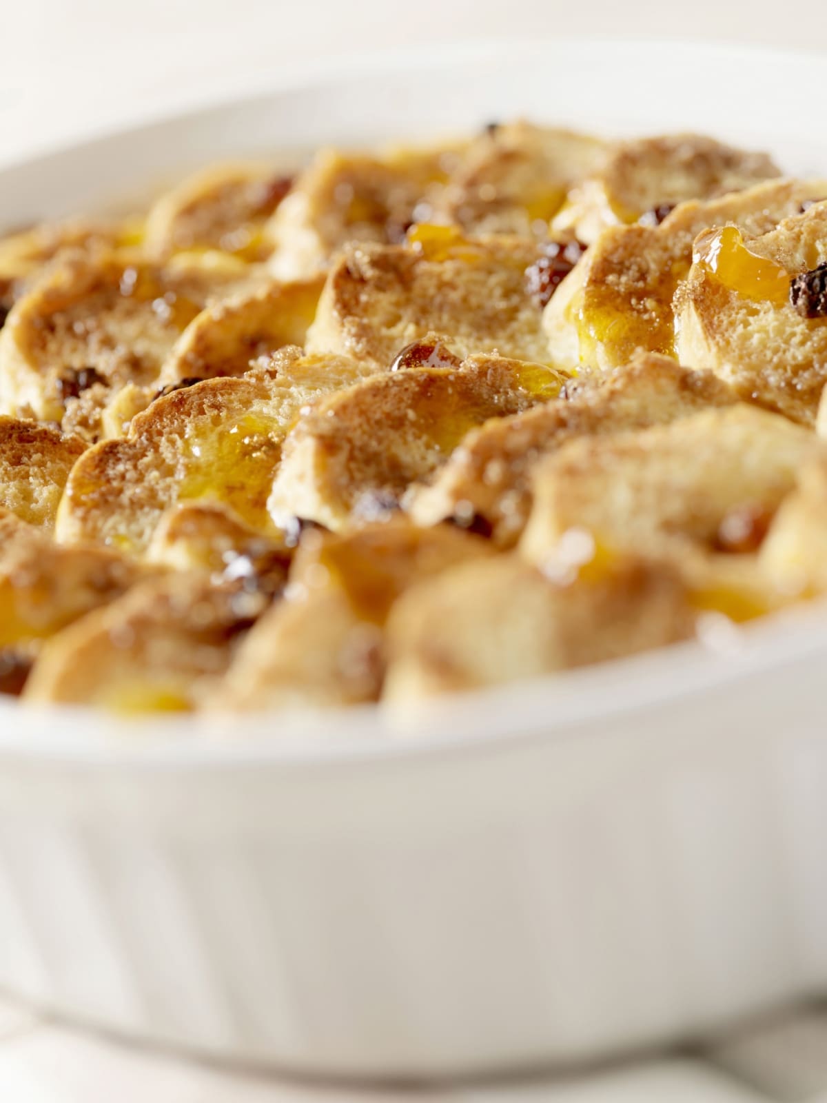 casserole. Arrange the bread slices over the raisins, slightly overlapping (if you need more bread slices add them). Dust with sugar.