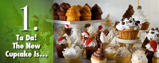1. Ta-da!! The Next Cupcake Is… Everyone wants to identify the “next cupcake” (NC) and to dethrone the mighty cupcake as the trend du jour – it’s become a love/hate relationship seasoned with a dash of backlash. Whoopie pies, macarons, small pies have all been contenders to become the NC, to the point where the cupcake has become almost a running joke. What’s relevant here is that people are looking for what’s fresh, exciting and…next. Well, it’s time to accept that the cupcake has gone from fad to trend to icon… and the movement now is more around its evolution than its dissolution. Today we’re seeing cupcake fondue, un-iced versions, savory varieties, flaming cupcakes, and shapes that are fat, skinny and mini—even cupcakes on a stick. It seems a new cupcake boutique bakery opens up every time you turn around. They’ve become almost as ubiquitous as ice cream parlors. On the home front, there are fancy new cupcake pans and cute little cupcake pedestals. In short, the next cupcake…is still a cupcake.