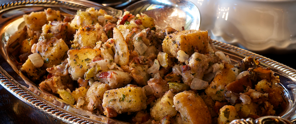 We’ve stuffed the bird with a New Orleans Oyster Dressing, a traditional favorite that dates back many years. The chef tells us the secret to creating the perfect crust for your holiday dressing is using a cast iron skillet.