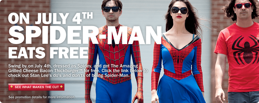 All you have to do is dress up like Spiderman and be one of the first 50 people to show up at a Hardee’s/Carl’s Jr. near you and you can claim a FREE Grilled Cheese Bacon Thickburger.