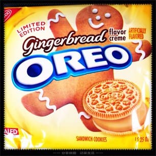 A sweet gingerbread flavored cream is sandwiched between two golden cookies. The cream is pretty much the same texture as that found in original Oreos and the ginger flavor is said to be more of a “hint,” and not too overwhelming. The cookies are a bit crunchier than regular Oreos, according to sources. (We haven’t had a chance to try them yet.)