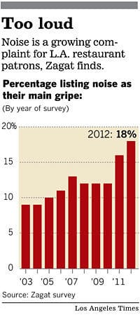 Many national restaurant reviewers now include noise level as part of their reports. According to Zagat, one of the best known of these types of businesses, noise has become the second-biggest complaint among diners, right behind bad service. In Los Angeles, 18 percent of diners ranked noise as their top peeve last year, Hsu reports. That’s up from 12 percent in 2010.