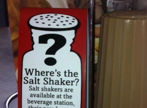 There will be signs at the tables where the salt shakers used to be, explaining its sodium reduction effort, and noting that salt shakers are still available at beverage stations.