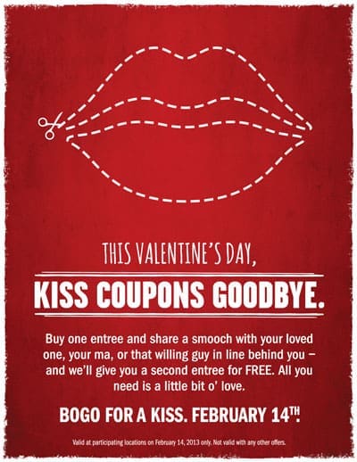 No coupon is required. All guests need to participate is a pair of lips and a willing kissing partner. (Offer must be redeemed at time of purchase).