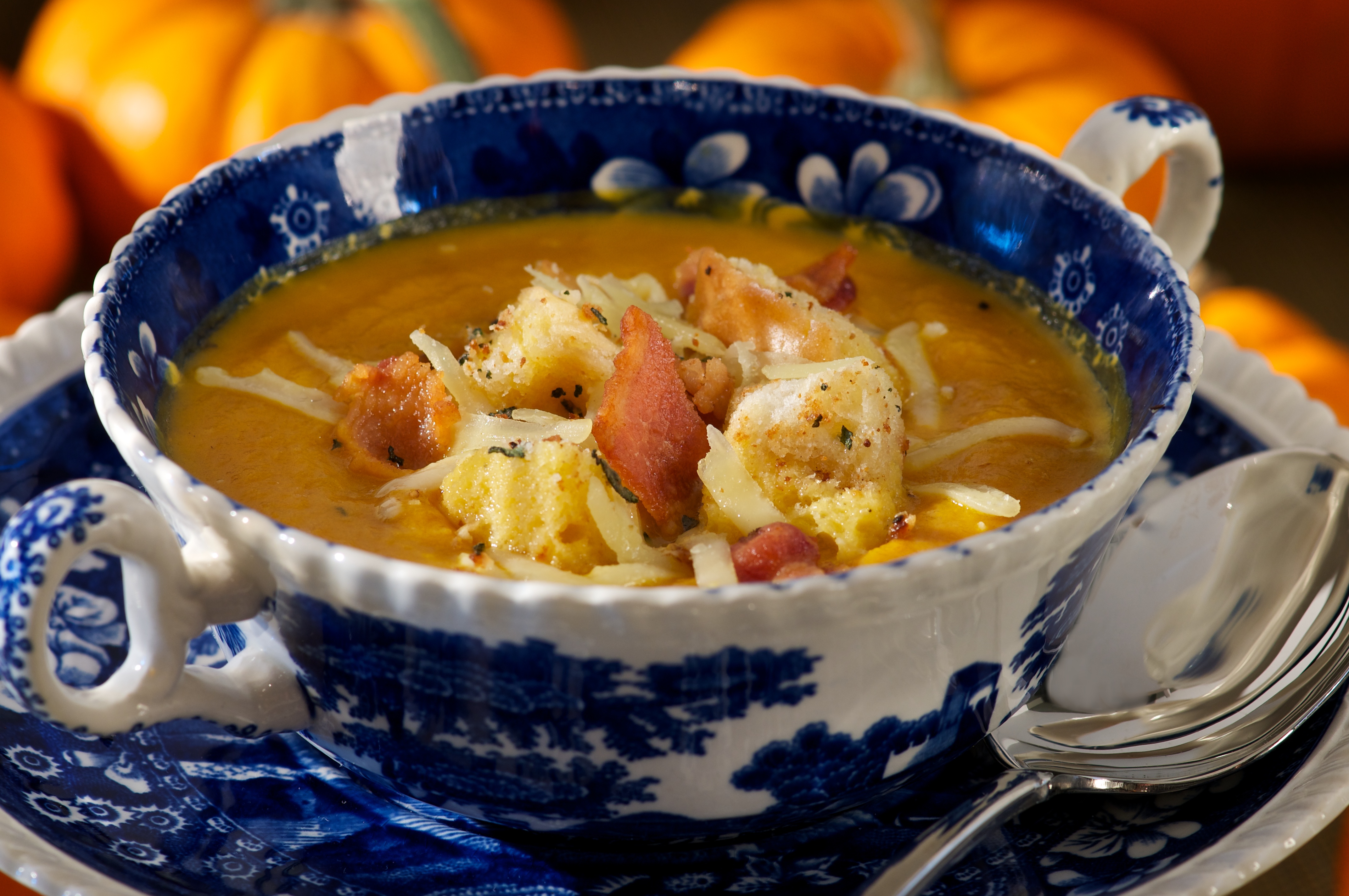 Pumpkin Soup with Sage Croutons, Bacon and Gruyere Cheese