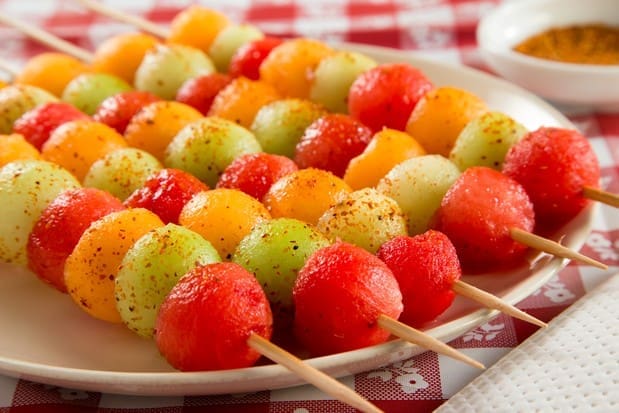 An adorable and easy side dish to pack for your next picnic with a hint of surprise flavor! Tajin is a seasoning made of chili peppers, lime and salt that adds a perfect refreshing kick to melons. Click here for the Melon Ball Skewer with Tajin recipe.