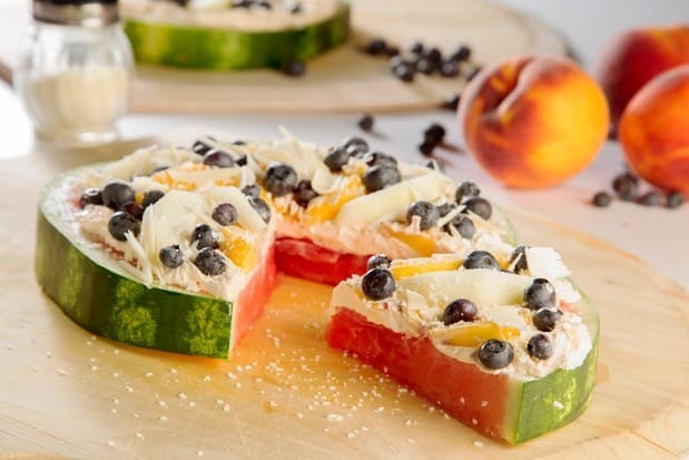 A refreshing and fun take on pizza, this Watermelon Peach Pizza is made with Peach cream cheese, whipped topping, fresh fruit and white chocolate. Simply delicious! Click here for the full Watermelon Peach Pizza recipe.