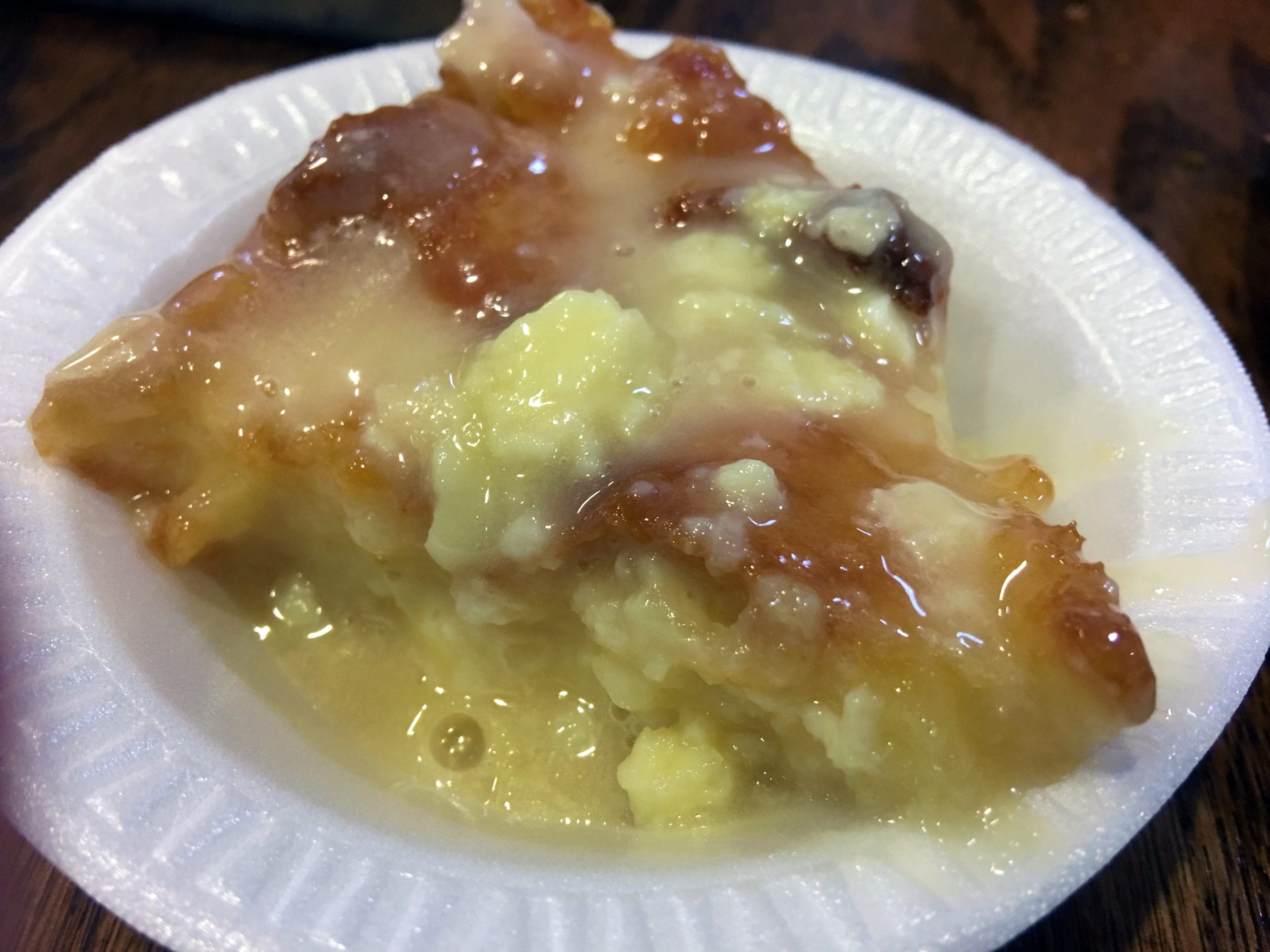 We tried to get the recipe, but were told it’s a closely guarded secret! One hint was all we got: the sauce has almond flavoring. We couldn’t get even an eyebrow raised as we guessed at the type of bread, quantity of eggs and cream, or how long it bakes. Just almond. If that’s enough to go on, let the re-creation attempts begin!
