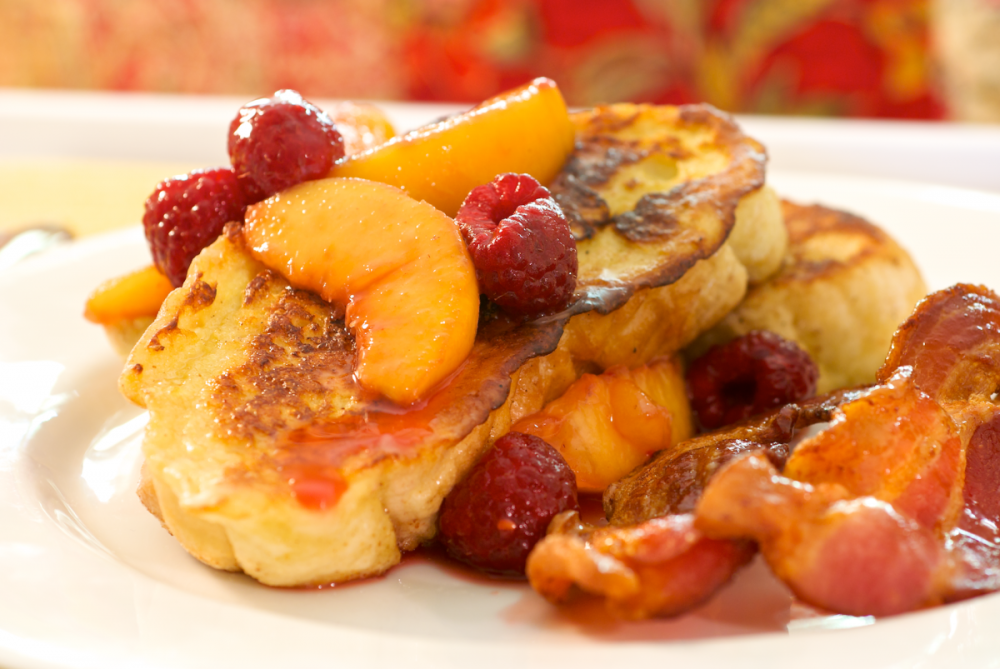Peaches and raspberries are the perfect addition of light sweetness to buttery French toast thatโs great with a side of crispy bacon or sizzling sausage. Who needs syrup when you can top your French toast with fresh fruit glazed in raspberry? Recipe here.