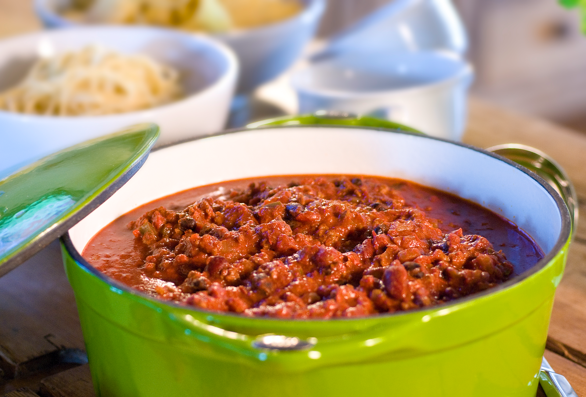 Delicious slow-simmered chili, ladled over your favorite pasta, with an assortment of toppings, including shredded cheddar cheese, fresh chopped tomatoes, diced red onions, sour cream, ripe diced avocados and tortilla chips. Recipe here.