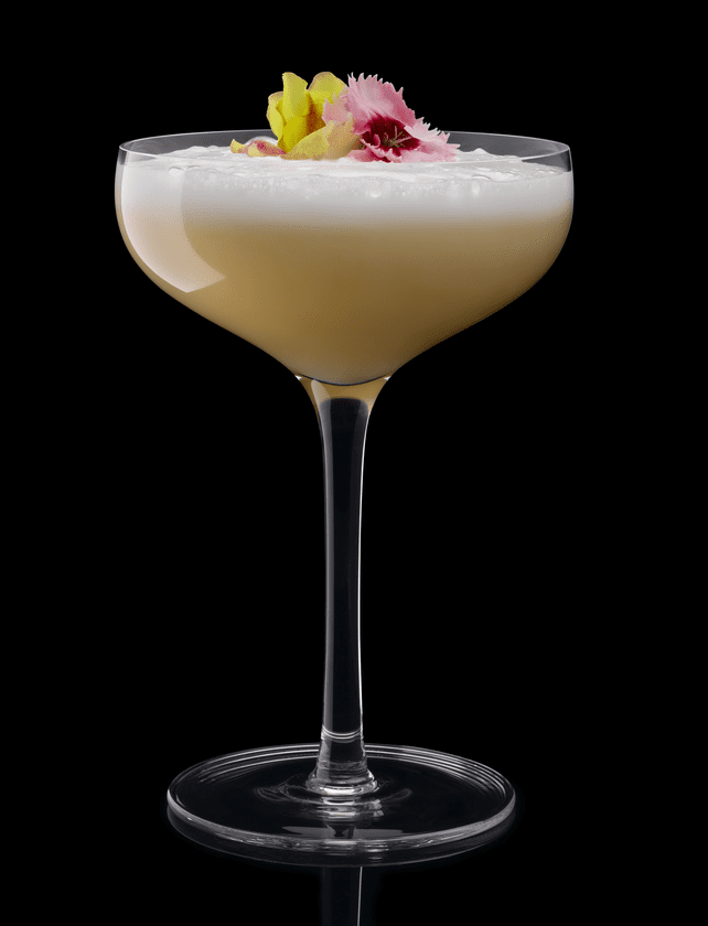 Shake all ingredients (1st time: no ice/dry shake. 2nd time: with ice) and strain into coupe glass. Serve in a cocktail glass with edible flowers.