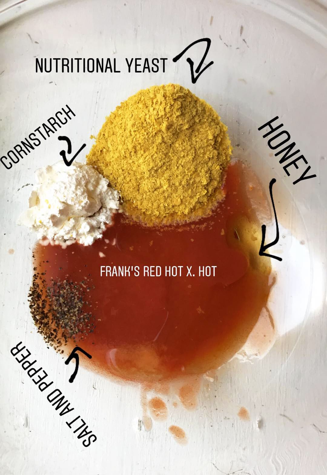 For my own recipe, I used Franks Red Hot Extra Hot Sauce, nutritional yeast, cornstarch, organic honey, salt, and pepper. No exact measurements were used, it is mostly to taste, minus the cornstarch which simply acts as a binding agent.