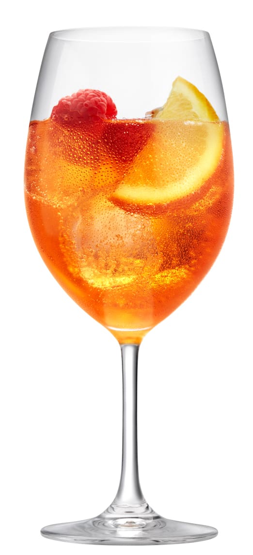 Build in a glass over ice. Garnish with an orange wedge and raspberries.