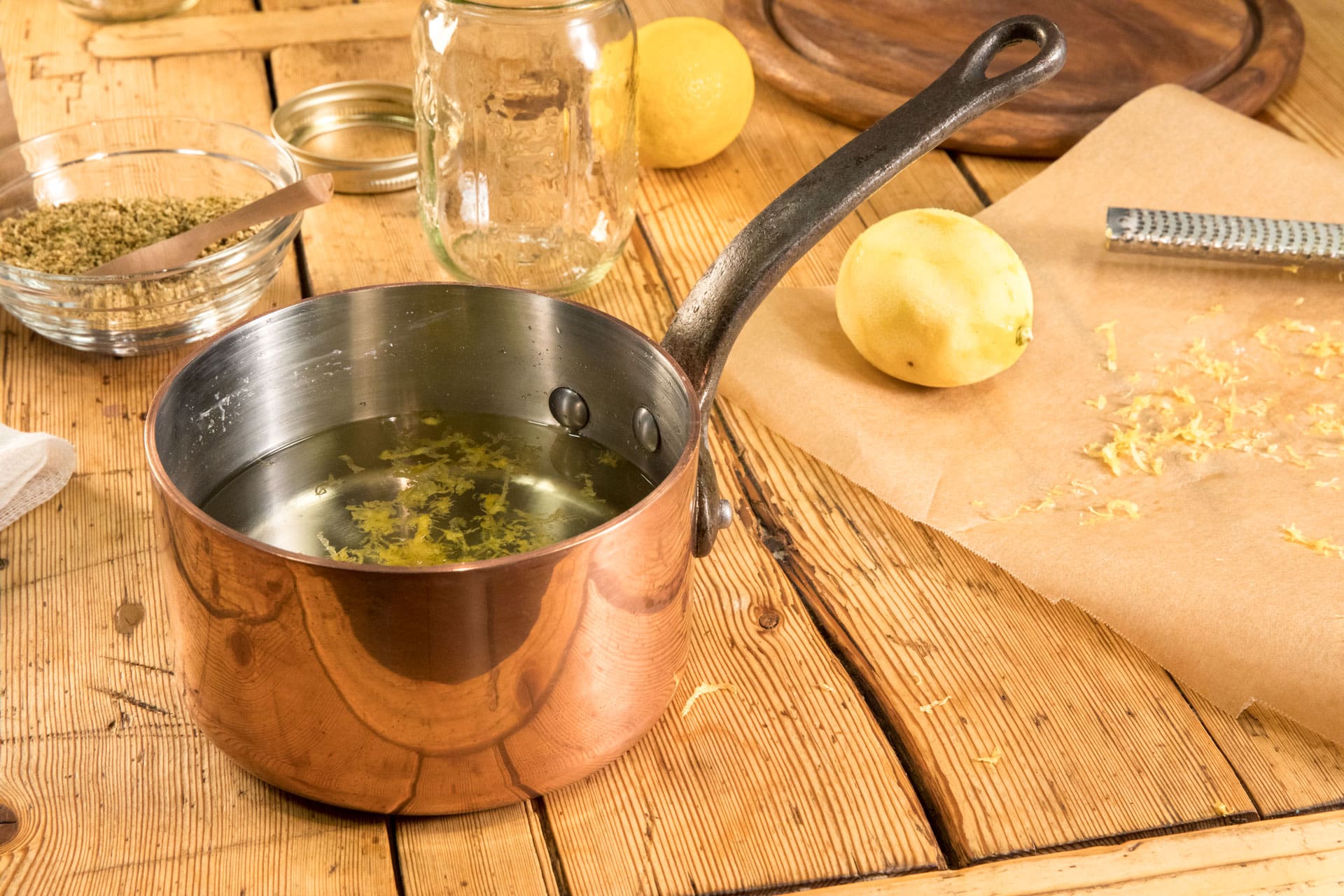 Pour the syrup evenly over the lemon and dried elderflowers.