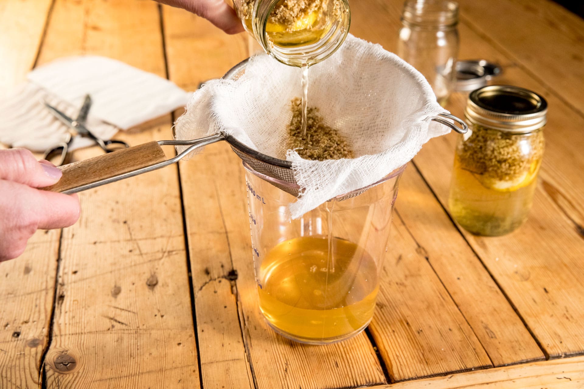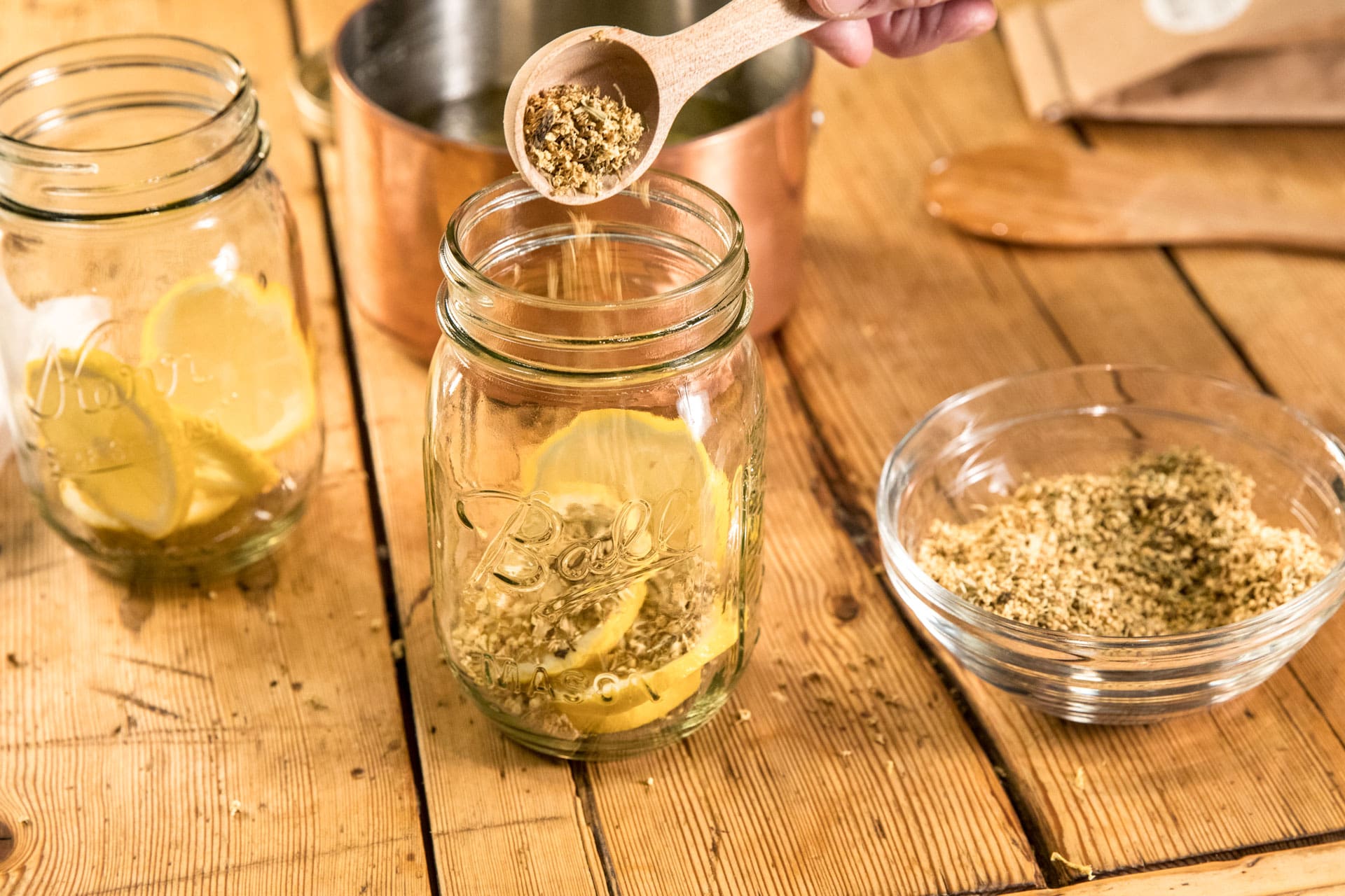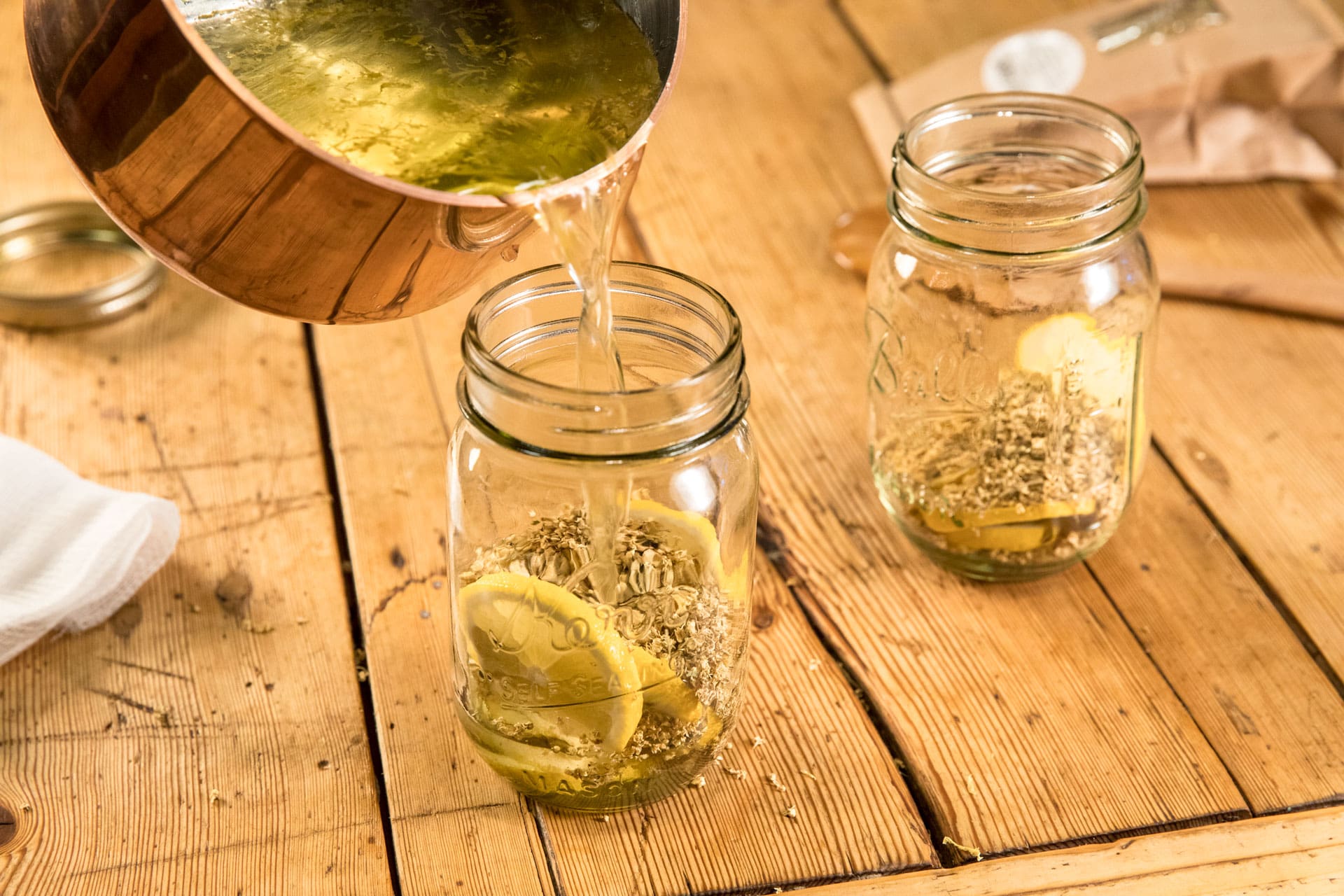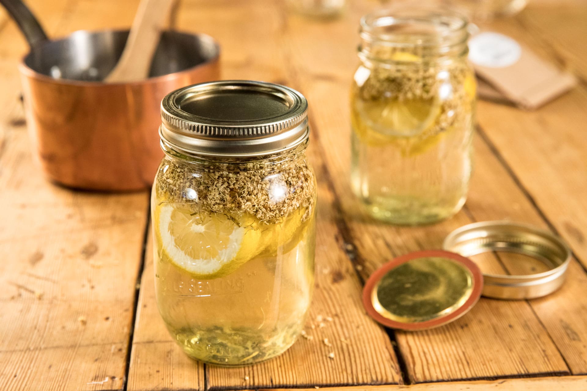 But, we’re getting ahead of ourselves. While you can certainly buy the elderflower syrup, it’s also fun to make it from scratch and have it on hand for any number of recipes. You just need some good-sized mason jars, cheesecloth, sugar, water, lemons, and dried elderflowers. Oh, and a little patience—it takes a couple of days to infuse the flavor.