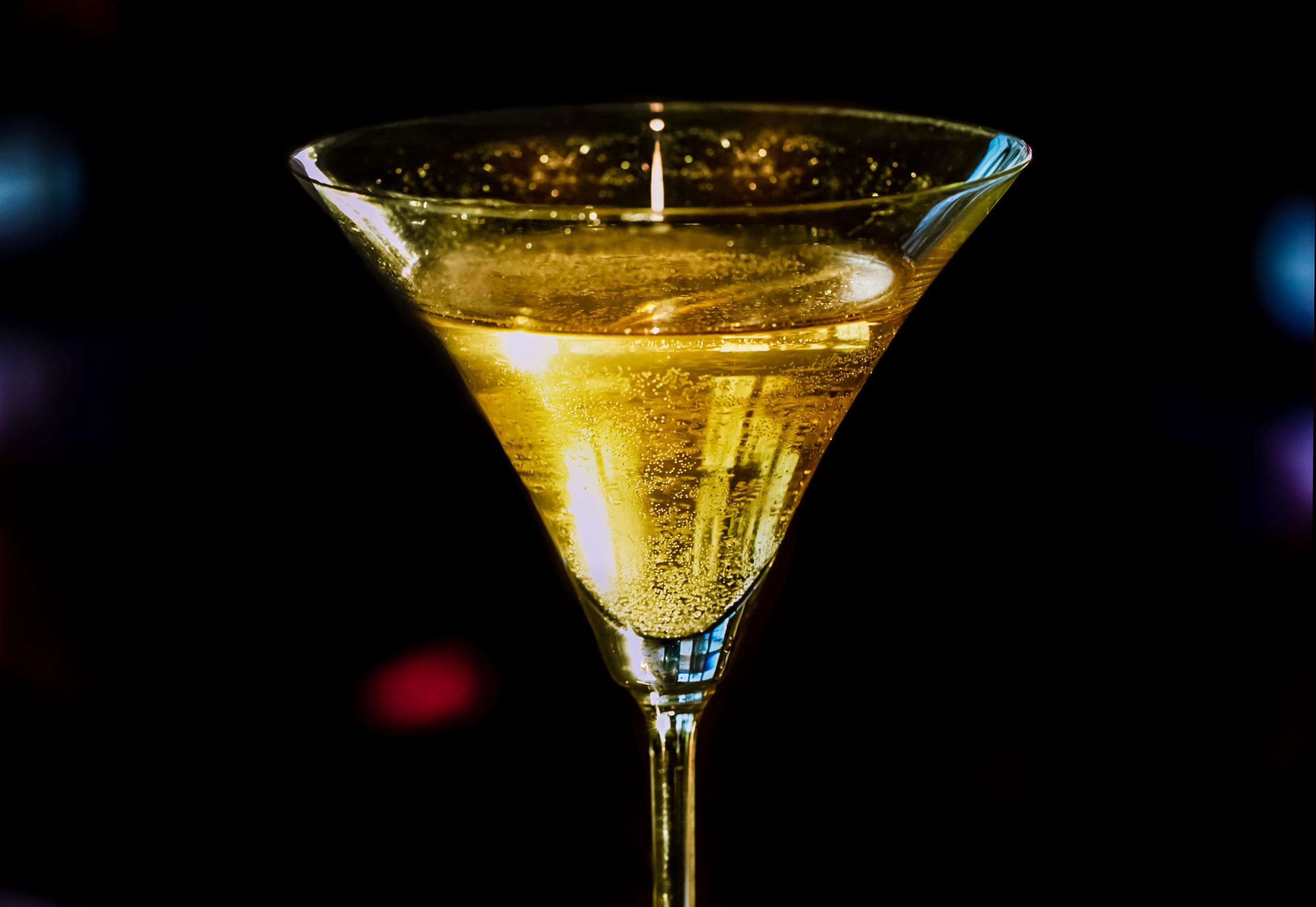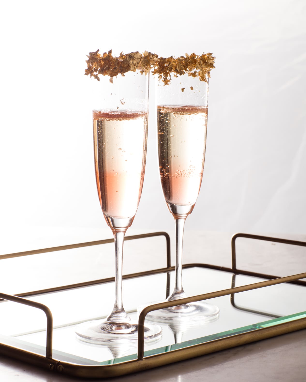 Garnish with flamed lemon twist, gold leafed twist (see notes below)