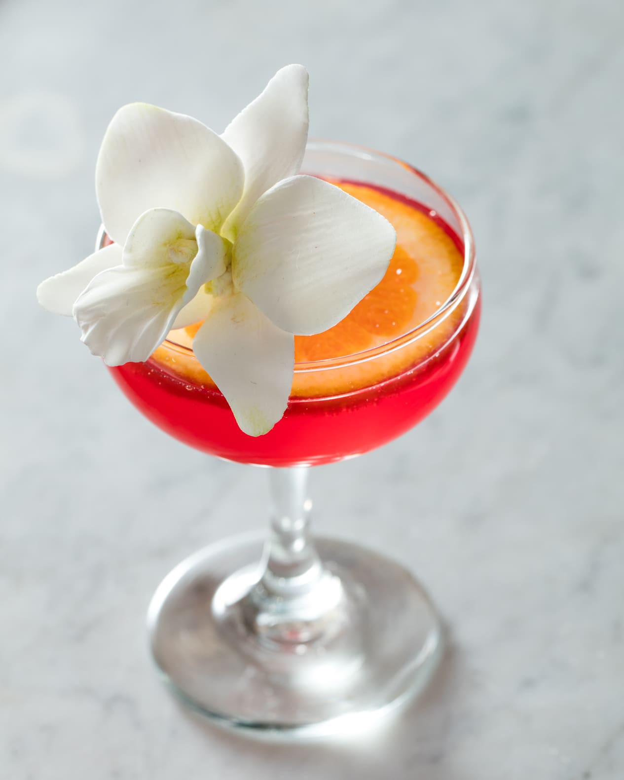 Shake all ingredients with ice and strain into a cocktail glass. Garnish with an edible orchid and orange round.