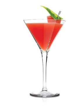 Shake all ingredients and strain into rocks glass with large ice cube and garnish with watermelon. Consider adding a peel of watermelon to enhance the garnish.