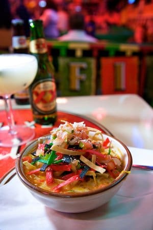 In fact, the flavors of many of the items are as bold as the Margaritaville-like decor. Try the enchiladas with blue corn tortillas, or the fresh salsa, or the pork tamales. In fact, try it all. The food is what Lee calls “ a mixture of Tex-Mex, Southwestern California Pacific, and Mexico for gringos.”